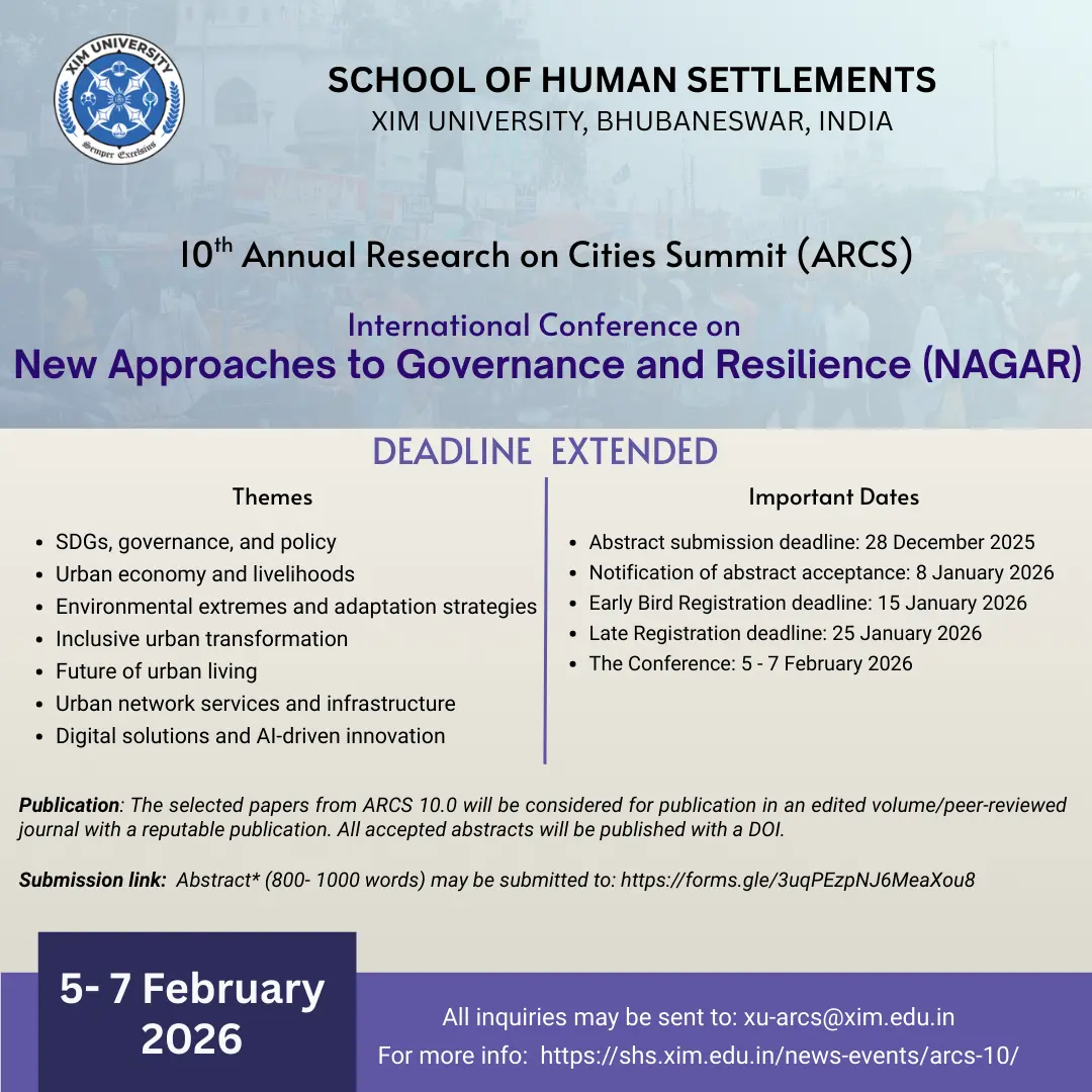 | Description | ARCS 10.0 – NAGAR is an international conference hosted by XIM University focusing on new approaches to governance and resilience in rapidly urbanizing cities, especially in the Global South. With themes ranging from inclusive urban transformation to AI-driven planning, the event invites multi-disciplinary perspectives to address urban inequality, infrastructure gaps, and climate challenges. Accepted abstracts will be published with DOIs, and select papers considered for a peer-reviewed volume. |